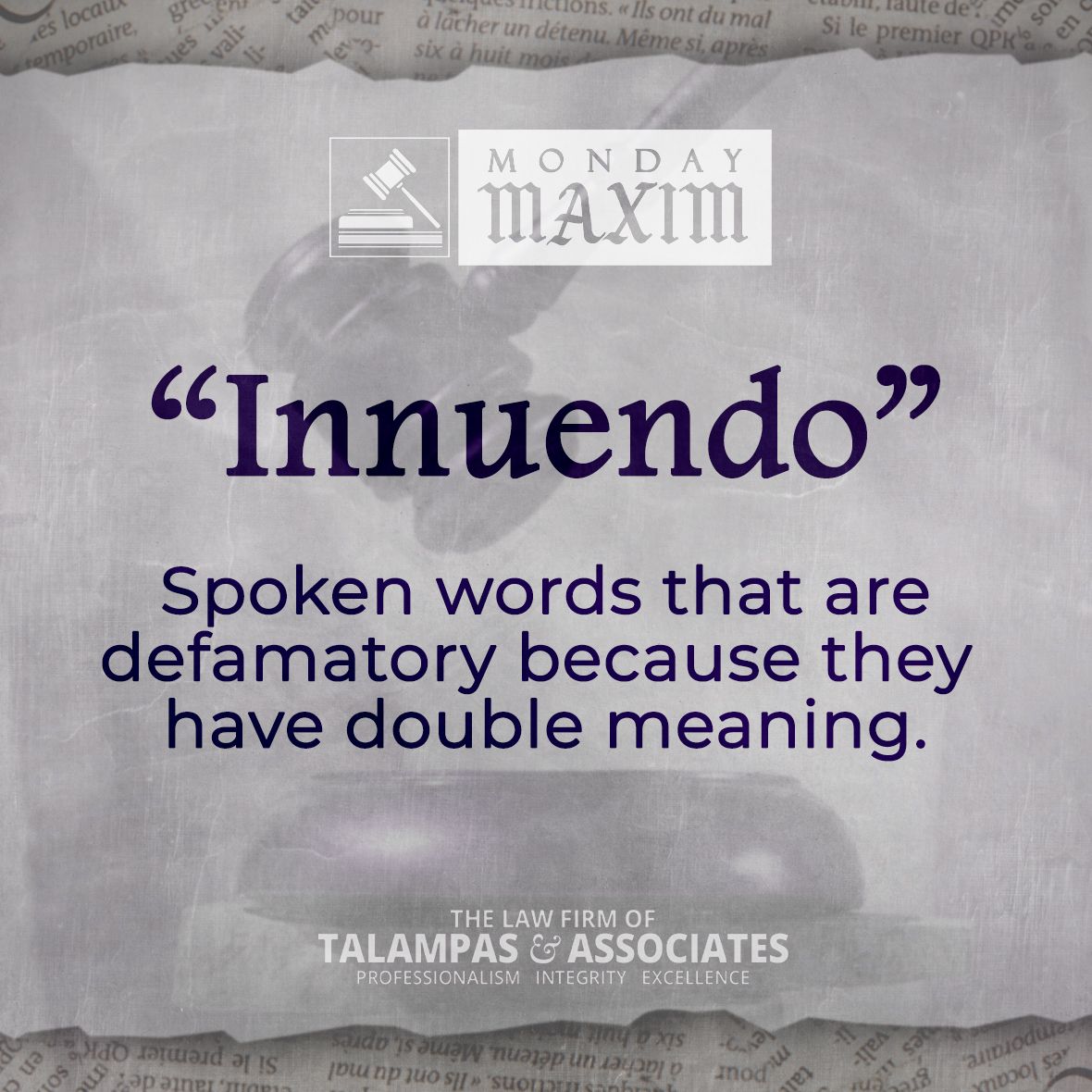 Spoken words that are defamatory because they have double meaning. An inuendo is a remark that suggests something but doesn't refer to it directly. Innuendos can be indirect or subtle, and are often made maliciously or to indicate criticism or disapproval. Example sentence: The election campaign was marred by rumor and innuendo. with a Photo:
