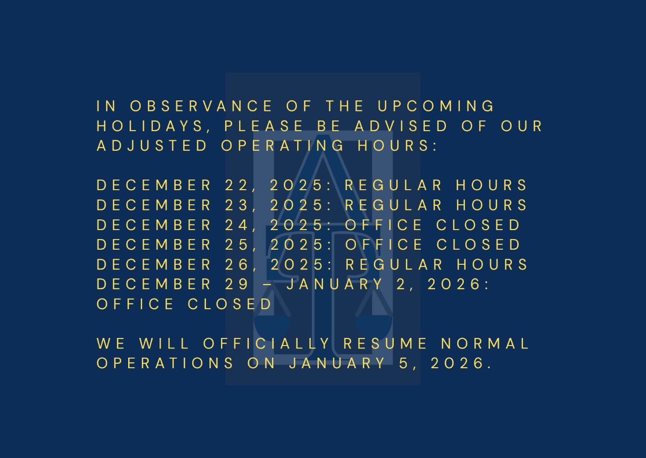 In observance of the upcoming holidays, please be advised of our adjusted operating hours: December 24 – 25: Office Closed December 26: Regular Business Hours December 29 – January 2: Office Closed We will officially resume normal operations on Monday, January 5, 2026. Urgent Matters: During these closure periods, our team will be checking urgent communications periodically. If you have an immediate legal emergency, please reach out via our email address at : talampasandassociates@yahoo.com We look forward to serving you in 2026 and beyond. Happy Holidays! with a Photo: