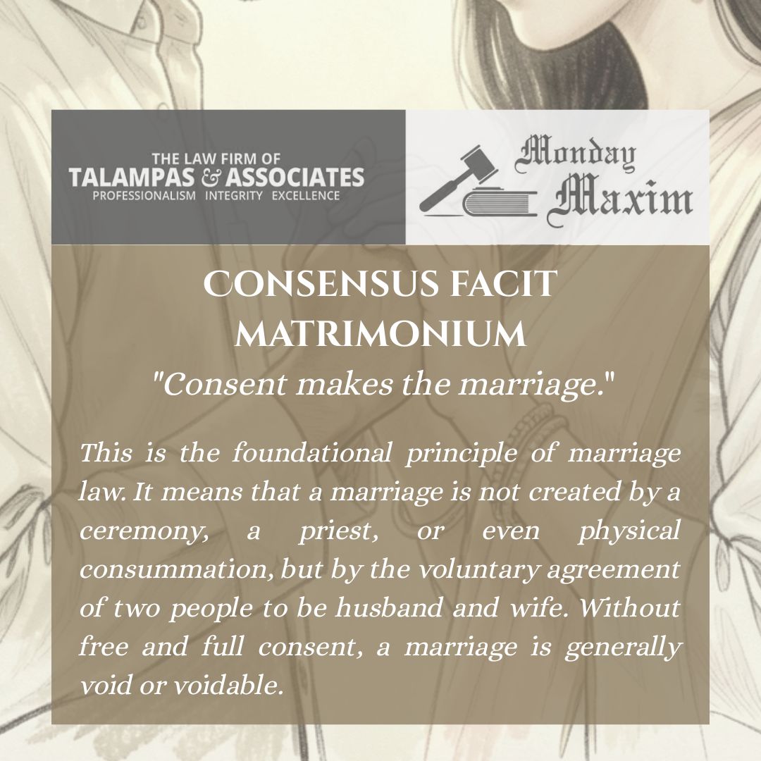 "Consent makes the marriage." This is the foundational principle of marriage law. It means that a marriage is not created by a ceremony, a priest, or even physical consummation, but by the voluntary agreement of two people to be husband and wife. Without free and full consent, a marriage is generally void or voidable. with a Photo: